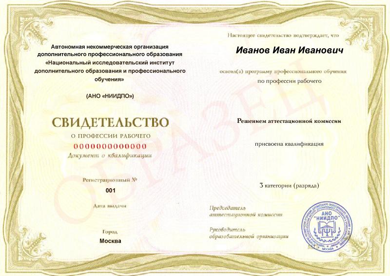 Обучающимся, завершившим обучение по основным программам профессионального обучения и успешно сдавшим квалификационный экзамен, выдается документ о квалификации – свидетельство о профессии рабочего или свидетельство о должности служащего, установленного образовательной организацией образца (в соответствии с Приказом Минпросвещения России от 26.08.2020 № 438).