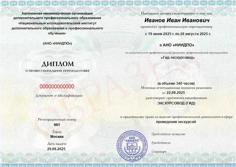 Да, документы оформляются на бланках с защитой от подделок, заполняются на русском языке, в них ставится печать АНО «НИИДПО».