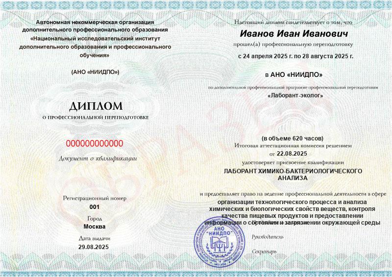 - Квалификация: Лаборант химико-бактериологического анализа