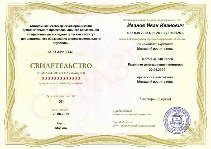 • Квалификация: Младший воспитатель