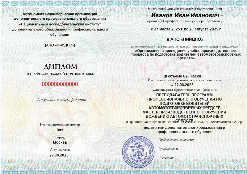 - 2 квалификации: Преподаватель программ профессионального обучения по подготовке водителей автомототранспортных средств + Мастер производственного обучения вождению автомототранспортных средств