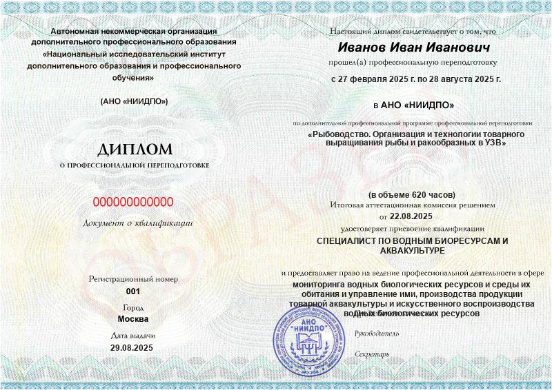 • Квалификация: Специалист по водным биоресурсам и аквакультуре