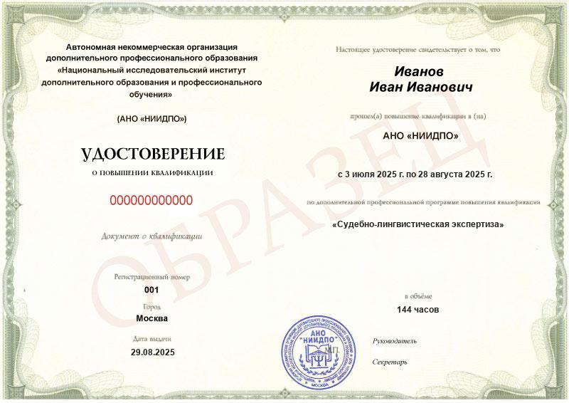 Да, документы оформляются на бланках с защитой от подделок, заполняются на русском языке, в них ставится печать АНО «НИИДПО».