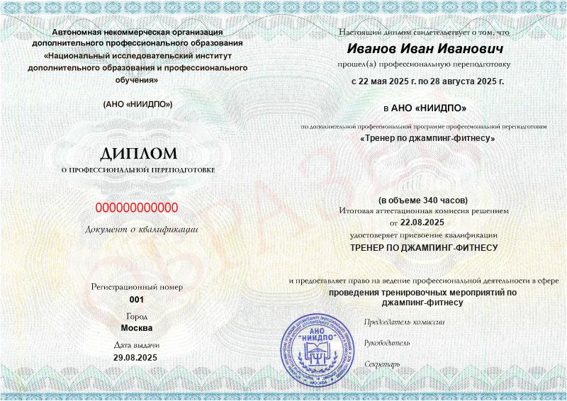 Курс по джампингу для тренеров можно пройти дистанционно. Профессиональная переподготовка позволяет стать востребованным специалистом в быстро развивающемся сегменте фитнес-индустрии и работать в клубах и спортивных центрах. По завершении программы вы получите диплом, который подтвердит вашу квалификацию
