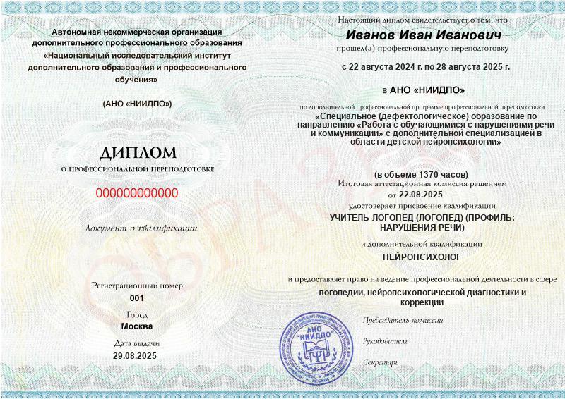 Специальное (дефектологическое) образование по направлению «Работа с обучающимися с нарушениями речи и коммуникации» с дополнительной специализацией в области детской нейропсихологии (1370ч)
