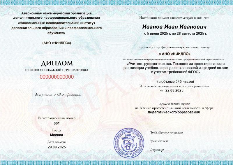 Да, документы оформляются на бланках с защитой от подделок, заполняются на русском языке, в них ставится печать АНО «НИИДПО».