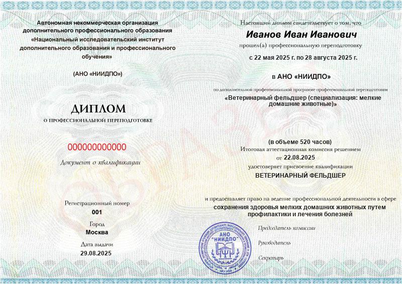 Тем, кому необходим документ о квалификации По завершении курса вы получите диплом ветеринарного фельдшера, который подтвердит вашу компетенцию и откроет возможности для работы в клиниках, лабораториях или зоосервисах.